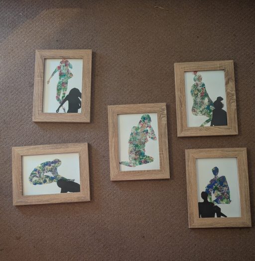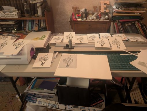 This week I attended two art groups, at the first we were given a selection of cardboard to construct a face or sculpture, working on an idea from last week of the cardboard collage image, I found a picture of Maude Wager in a magazine and set to work. The result was interesting, with limited tools and cardboard it was good fun. Wednesday was another art group but left to our own devices, I always carry pencils and sketchbook so settled down for an hour or so sketching images from my phone. IN the studio I was slowly tackling the carving of the dandelion lino print, once complete I set out to print, the press was not feeling favorable and I was short of time to reset and get the desired result so I went for the tried and tested brayer method, one of the prints has already sold, but they are currently on the drying rack to avoid any risk of smudges during framing, I may attempt a gold leaf accent on one or too. I used water based ink and feel the prints are clear and sharp which was pleasing with the intricate design. I enjoy the carving, so a daisy design might be on the cards next, I will try to take progress photos for a future blog. you can use the contact form if you are interested in a print, they are A5 and will be framed by the end of the week.