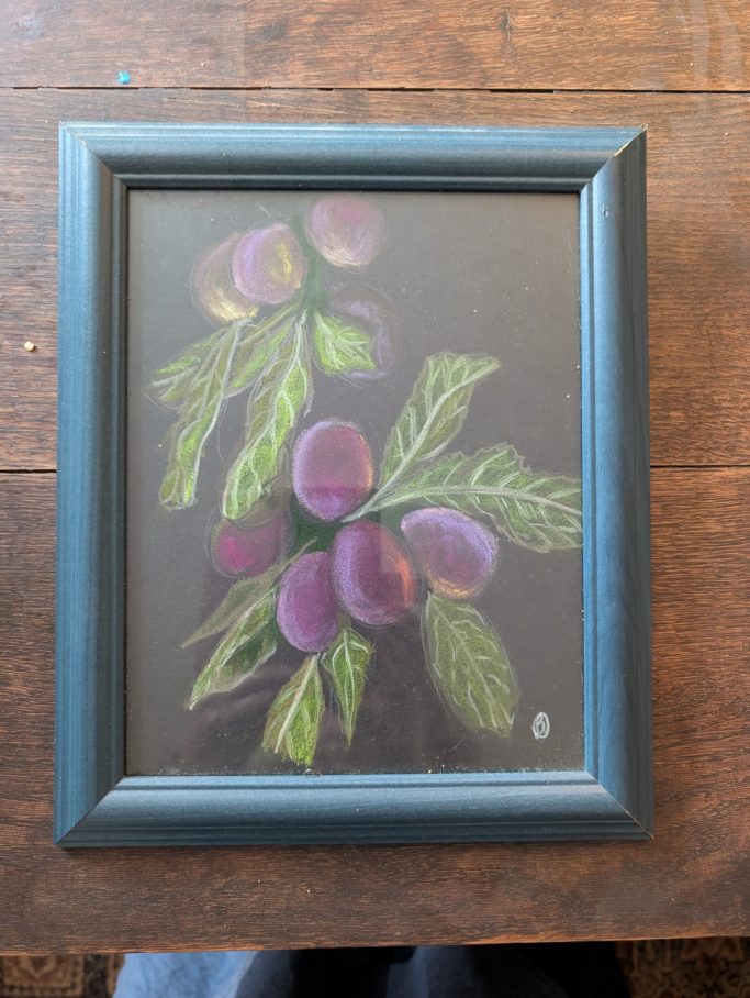 The framed plums are available whatsapp 079009891195 or contact from here for details Soft pastels on black paper