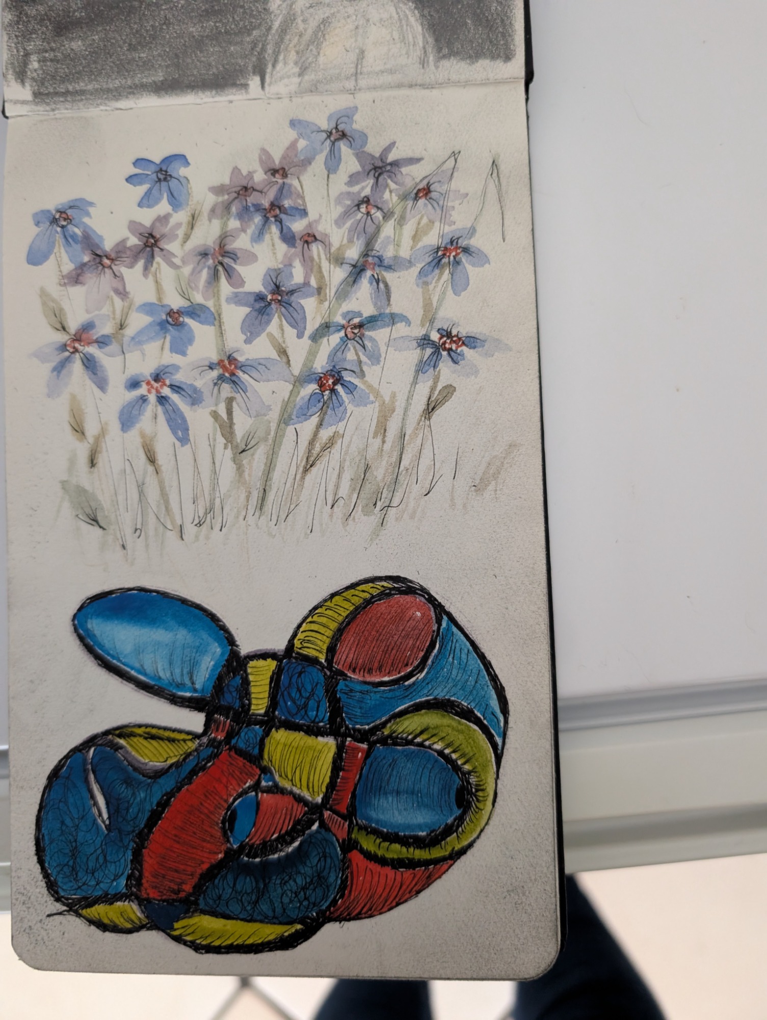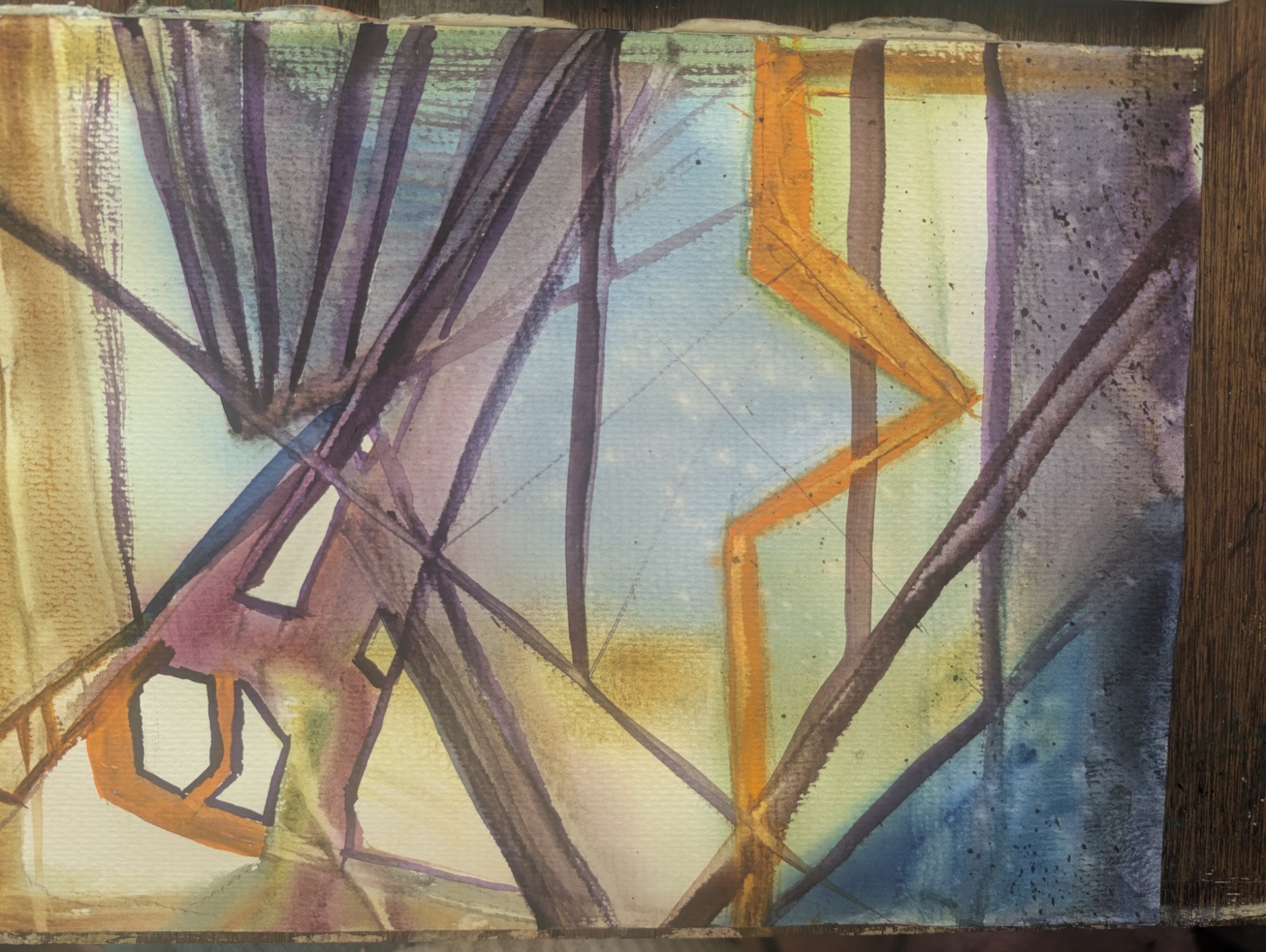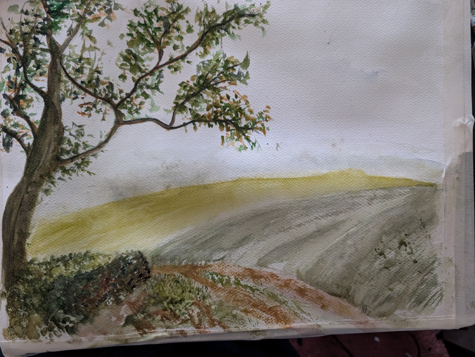 Lots of preparation this week for the Watchet art club Plein air session on Wednesday, plus preparation for Septembers exhibition. I also completed my piece for the collaborative mural of Watchet , my medium was water colour and a series of A4 images will be combined and displayed in the methodist church, harbour rd , Watchet An interesting abstract session, where a simple object was sketched in 5 mins then a part abstracted to create a piece with water soluble pens, which turned out not to be . Then a cacophony of sheep to film the time at art group, exploring loose sketching.